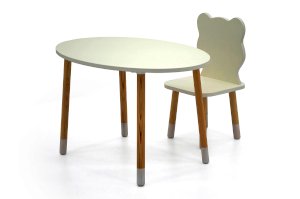 Края столешницы закруглены и покрыты кромкой ПВХ для безопасности ребёнка. Ножки стола тщательно отшлифованы и покрыты лаком на водной основе. Нижняя часть ножек окрашены белой эмалью на водной основе.