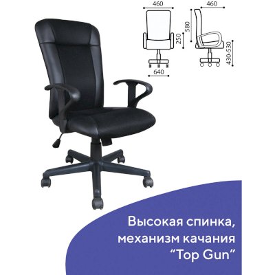Кресло оснащено механизмом качания «топ-ган» с регулировкой под вес пользователя и возможностью фиксации спинки в рабочем положении.