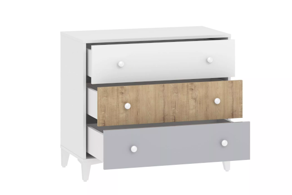 Комод «Морти» - прекрасный выбор для интерьера в стиле Современный, Модерн, Скандинавский. Три удобных выдвижных ящика станут вместительным место для хранения белья, предметов одежды и аксессуаров. В оттеночной гамме мебели царит стильное сочетание современности, изюминкой модели являются цвета ящиков: белый, серый и дуб бунратти.