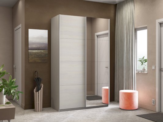 Серия «Прайм» отличается доступностью и функциональностью Навесные двери и лаконичная отделка фасадов создают прогрессивный дизайн. Подойдет тем, кто любит компактную и изящную мебель. Алюминиевые ручки и верхний ходовой профиль обеспечивают легкость и прочность конструкции. Многолетняя безупречная работа благодаря высококачественной немецкой фурнитуре Hettich. Прочная ПВХ-кромка толщиной до 1 мм защищает края от сколов и повреждений. Плавный ход дверей обеспечивает надежная система Hettich Top Line M. Дополнительно можно установить доводчики. Снаружи нет заглушек и винтов благодаря стяжечной системе крепления полок на флипперах, а корпус усилен эксцентриковыми стяжками. Навесные двери скрывают раздвижной механизм от глаз. Они надежно удерживаются в направляющих и не соскакивают. Каждая дверь поделена на 4 секции Секции расставляются в произвольном порядке, создавая новый дизайн фасада.