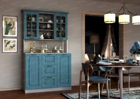 Ослепительная чистота и свежеть царят на кухне, обставленной мебелью из гарнитура «Кантри». Особую атмосферу создает отделка бирюзового, голубого, сиреневого цветов. Простой дизайн и хорошо различимая текстура натуральной древесины придает интерьеру деревенскую стилистку. Для изготовления комплекта использованы качественные и экологичные материалы.
