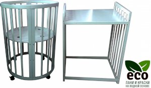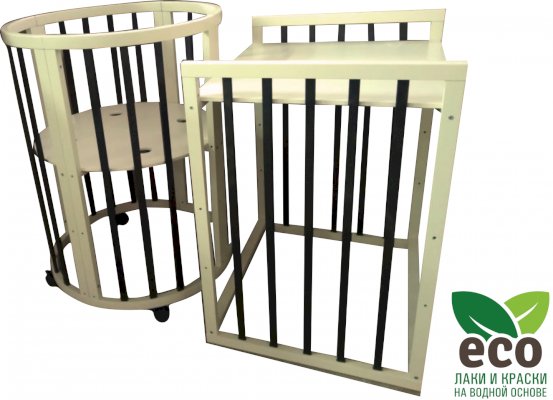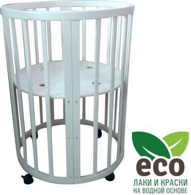 Выполнена из отборной бессучковой древесины березы без стыков, склеек и из высокопрочного МДФ. Привлекательный внешний вид достигается за счёт использования технологии скрытия стыков и метода тройной шлифовки. Покрыта нетоксичными лаками и красками на водной основе. В комплекте имеется 4 колёса с возможностью установки в различных положениях (для круглой и овальной кроватки).