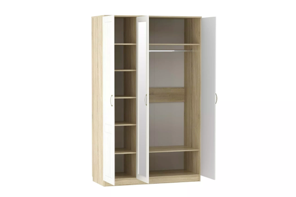 Трехстворчатый шкаф Оливия НМ 040.33 X поможет организовать систематизированное хранение вещей. Вместительная секция со штангой подходит для размещения длинных шуб, пальто и платьев. На широкую верхнюю полку в центральной части модуля можно сложить те вещи, которые нужны не часто. Отделение с пятью полками обеспечит место для хранения трикотажной одежды. Центральная дверца шкафа оборудована зеркалом, в котором можно увидеть себя в полный рост.