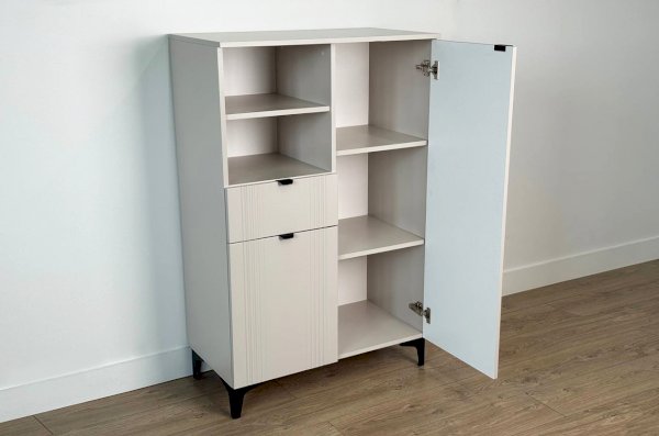 Дизайн комода продуман до мелочей: с одной стороны расположена глухая дверца, за которой скрывается просторное пространство для хранения. С другой стороны – ниша с открытой полкой, выкатной ящик и ещё одна глухая дверца, что позволяет гибко организовать хранение и поддерживать порядок в доме.