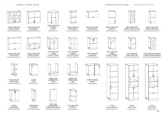 Специально для тех, кто отдает предпочтение классическому дизайну, создана кухня «Греция». Правильные пропорции, отделка естественных цветов и фактур, элегантное декорирование смотрятся беспроигрышно. Из элементов этой модульной системы удается собрать комплект для помещений различной площади и планировки. Готовый гарнитур может быть как угловым, так и прямолинейным.