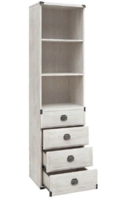 Шкаф разделен на 2 отделения: верхнее –открытое отделение с полками, нижнее – 4 выдвижных ящика на металлических роликовых направляющих