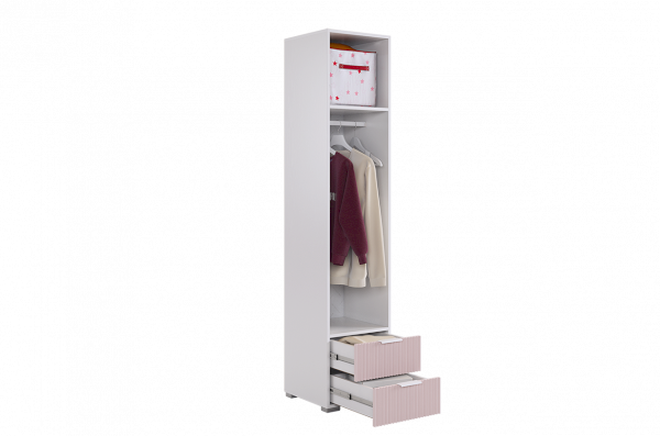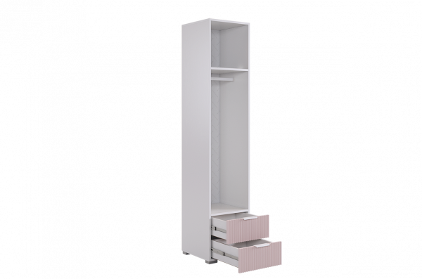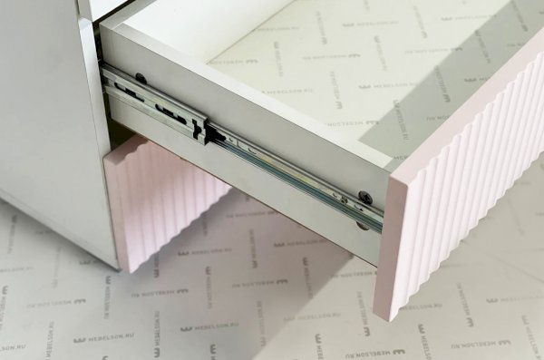 Шкаф изготовлен из прочного материала – лдсп белого дерева, а фасады выполнены из качественного мдф с использованием эмали цвета пудра розовая, добавляющей бархатистость и нежность. Вертикальные полосы на фасаде создают эффектный акцент с использованием фрезеровки.