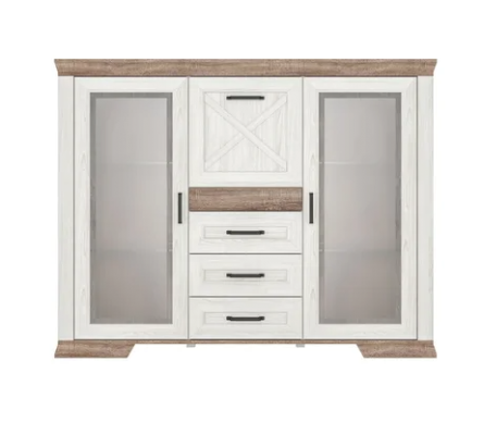 Тумба разделена на 4 отделения: 2 отделения с полками за распашными дверями со стеклянной вставкой,