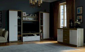В гостиной Соната применяются современные европейские декоры: корпус выполнен из ЛДСП Дуб сонома, фасад из ЛДСП Белый глянец. Декоры отличаются выраженной тёплой древесной текстурой, а фасадная часть подчёркнута горизонтальными линиями текстуры и стильными планками МДФ, представляющими собой элементы корпуса и фасада.