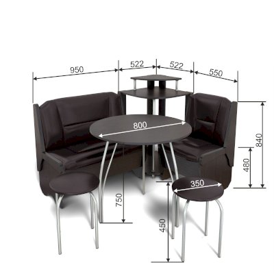 Оригинальный кухонный уголок Лотос отличается от других похожих кухонных гарнитуров. Он состоит из двух отдельных диванчиков и этажерки, заменяющей угловую мягкую часть. Круглый кухонный стол в отличие от других наборов мебели на металлическом основании как и два круглых табурета. Набор мебели для кухни включающий в себя большую прямую скамью,малую прямую скамью,угловую этажерку, стол на металлических ногах и два табурета на металлокаркасе. В прямых скамьях под сиденьями расположены ящики.